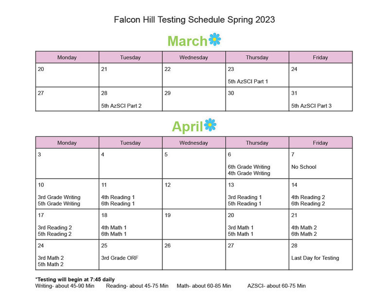 Spring is here at that means it is time for Spring Testing here at the Hill. Our 3rd - 6th grade students will begin testing soon. Below is the schedule of test days.